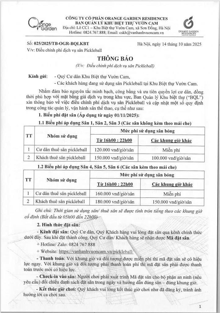 Nhằm duy trì chất lượng dịch vụ, đảm bảo công tác vận hành sân thể thao được ổn định, đồng thời tạo sự công bằng và minh bạch trong việc sử dụng, Ban Quản lý xin thông tin tới Quý Cư dân về việc điều chỉnh mức phí sử dụng sân Pickleball như trong Thông báo chính thức số 025/2025/TB-OGR-BQLKBT ngày 14/10/2025.