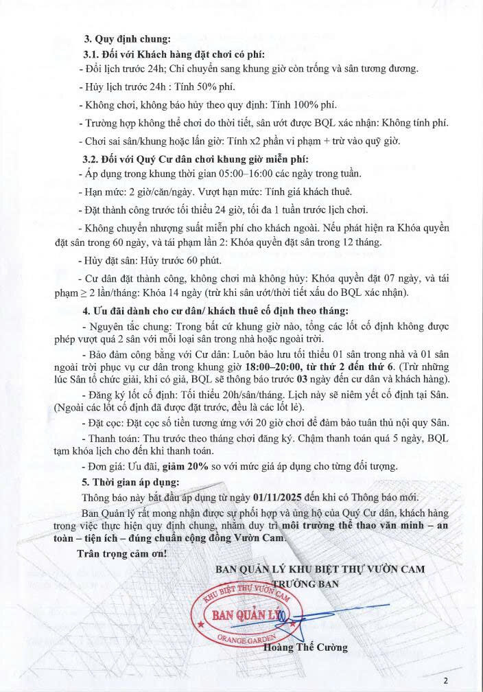 Kính gửi Quý Cư dân, Quý Khách hàng đang sử dụng sân Pickleball tại Khu Biệt thự Vườn Cam,